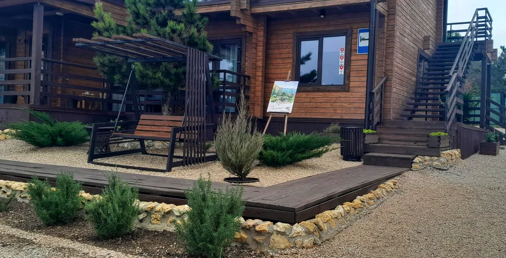 Ухоженная территория с большой парковкой, качелями, мангальной площадкой и южными растениями закрыта от посторонних.