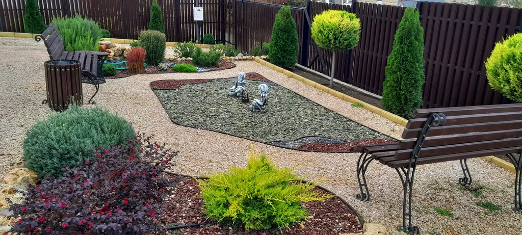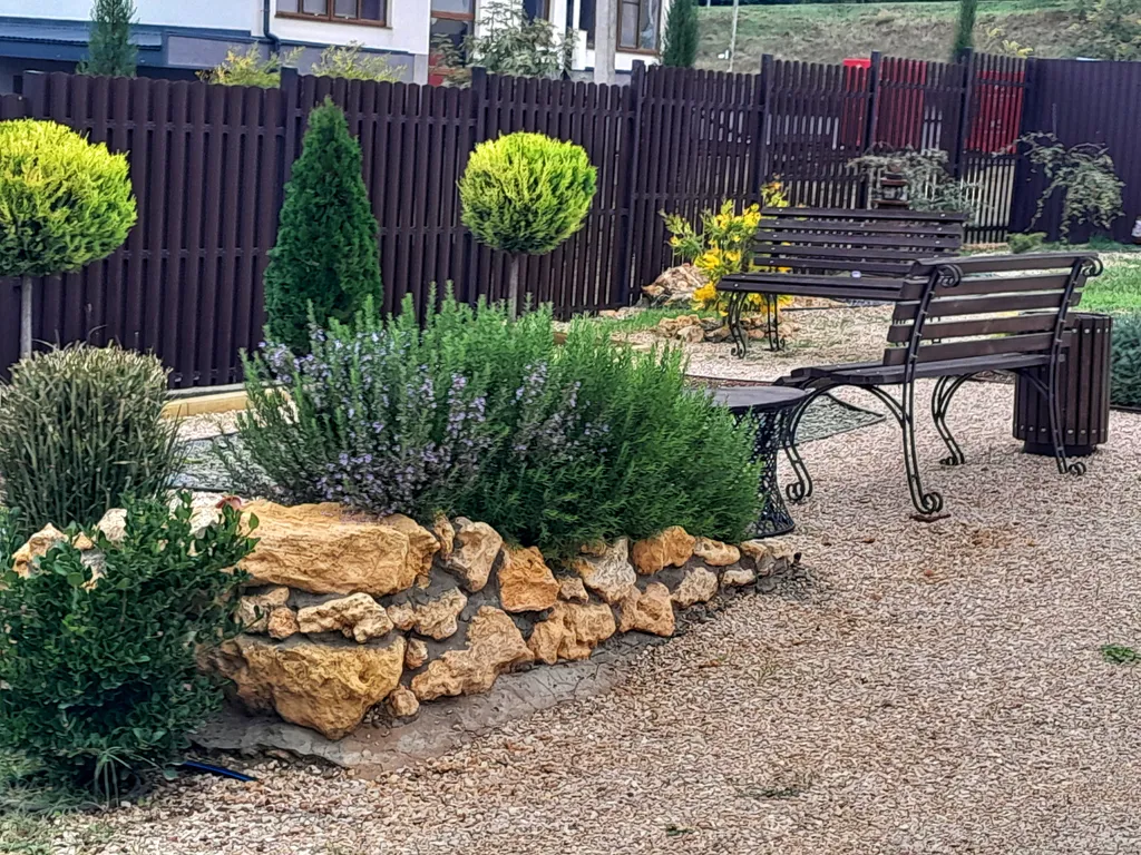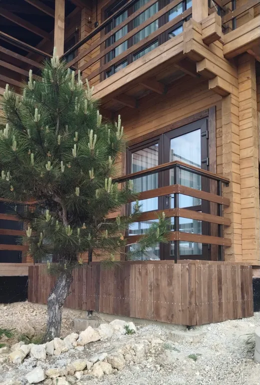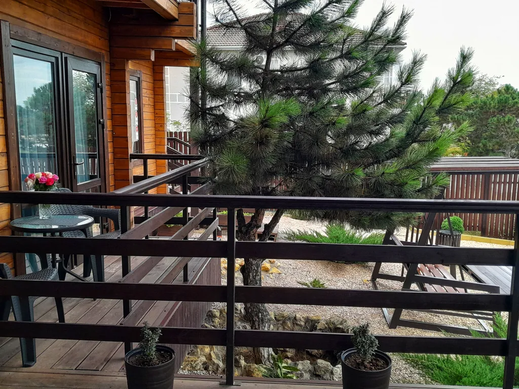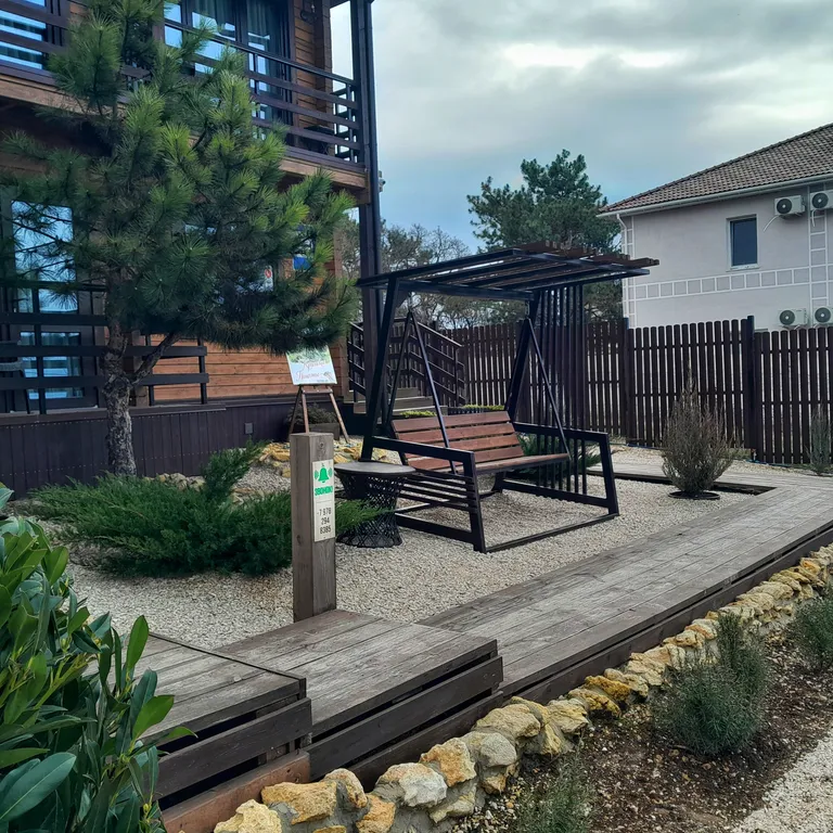 Ухоженная территория с большой парковкой, качелями, мангальной площадкой и южными растениями закрыта от посторонних.
