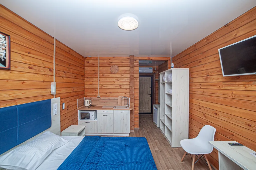 Инверторный кондиционер и инфракрасный обогреватель в санузле хорошо согревают, и гостям комфортно в студиях круглый год.