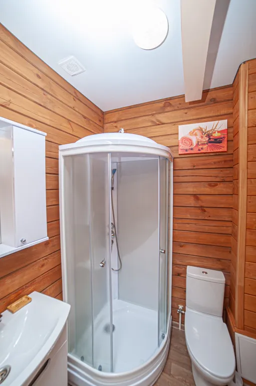 В санузле — душевая кабина, белые полотенца, фен.